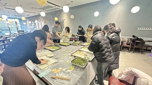 亞歲將至蒼穹美,喜迎新晝皆歡“寓”,冬至之日,嵩山美寓聯(lián)合中信銀行,組織廣大美寓青年共同在共享空間開展包餃子主題活動。暮色將至,嵩山美寓一層大廳燈火輝煌、門庭若市,在大廳共享廚房,面粉、廚具原材料鋪展開來。美寓青年陸續(xù)來到共享空間,挽起袖子、摩拳擦掌。大家相互配合,和面、加水、搟面皮,不一會的功夫,一個個形狀奇巧餃子皮“橫空出世”。
