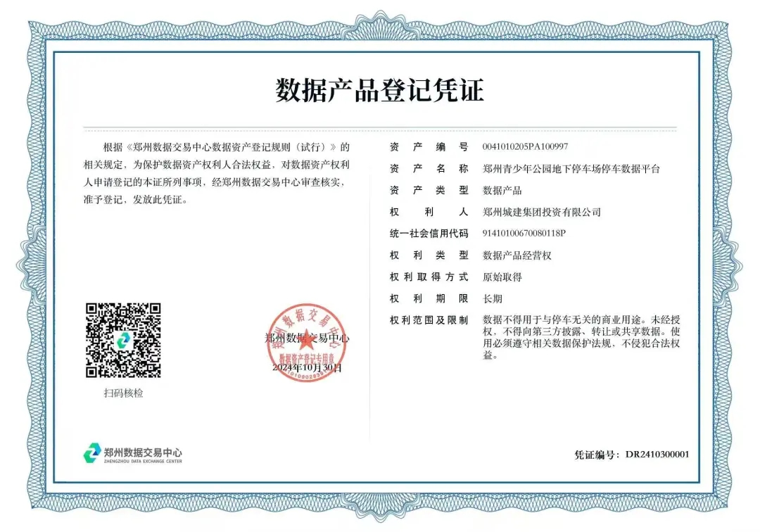 10月30日,城發集團下屬子公司鄭州城建集團投資有限公司(以下簡稱“城建集團”)在鄭州數據交易中心成功完成了“鄭州青少年公園地下停車場停車數據平臺”數據產品的資產登記,喜獲數據產品登記憑證,成為鄭州市首家將停車數據資產入表的國有企業。