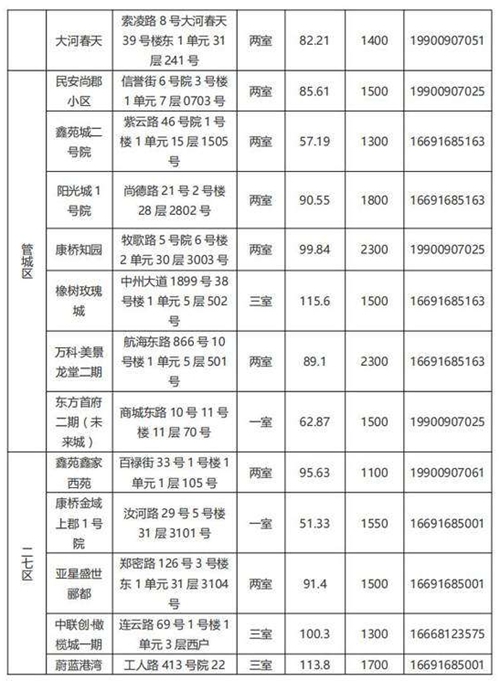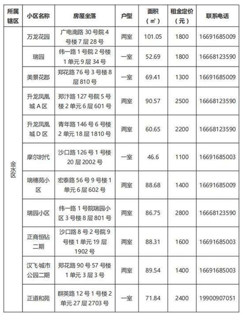 本批次配租房源共計32套,其中金水區(qū)12套、管城區(qū)7套、二七區(qū)8套、中原區(qū)1套、鄭東新區(qū)3套、惠濟(jì)區(qū)1套。水電費(fèi)均為民用水電標(biāo)準(zhǔn),物業(yè)費(fèi)為各小區(qū)物業(yè)收費(fèi)標(biāo)準(zhǔn),房源精裝修交付,周邊配套設(shè)施齊全,配備家具家電,拎包入住,后續(xù)房源將根據(jù)裝修進(jìn)度情況陸續(xù)配租。