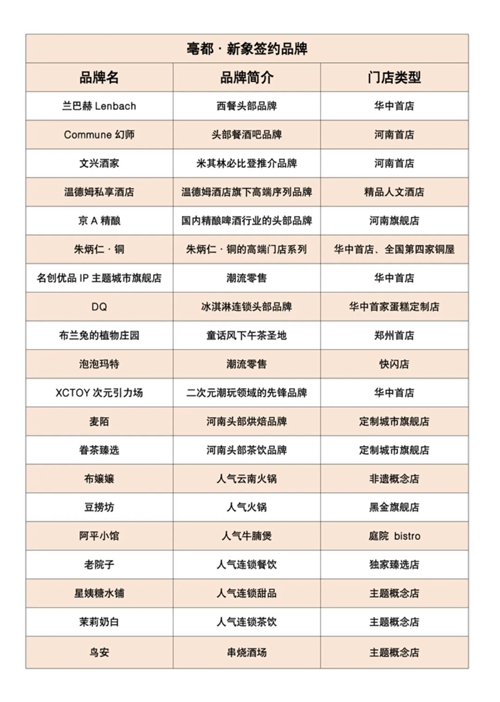 發布會上,蘭巴赫LENBACH華中首店、COMMUNE幻師河南首店、米其林必比登推薦的文興酒家河南首店、溫德姆私享酒店、京A精釀河南旗艦店、朱炳仁·銅全國第四座銅屋“中原銅屋”華中首店、名創優品IP主題城市旗艦店華中首店、XCTOY次元引力場華中首店、DQ華中首家蛋糕定制門店、布蘭兔的植物莊園鄭州首店…等品牌確定進駐項目,占比超30%的首進品牌,讓亳都·新象成為鄭州首發經濟的策源地之一。