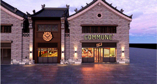 以COMMUNE幻師的門店設計為例——從效果圖可以看出,建筑外部以青灰色磚墻復刻商代建筑肌理,檐角神獸造型融入現代燈光設計,整體風格充滿著古樸與時尚。店內則以暖色調營造松弛感,酒墻擺滿了來自全球的精釀。每當味蕾觸碰到精釀的麥香,窗外同時飄入來自3600年前夯土的氣息——在這里,顧客喝的不是單純的酒,而是歷史與現代的奇妙敘事。