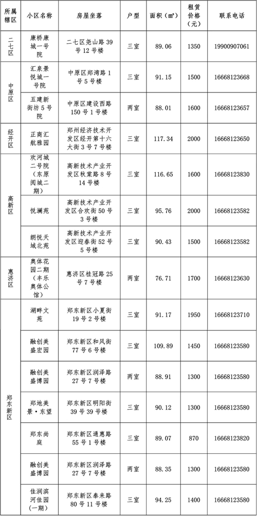 本批次配租房源共計15套(41間),其中為二七區1套(3間)、中原區2套(5間)、經開區1套(3間)、高新區3套(9間)、惠濟區1套(2間)、鄭東新區7套(19間)。水電費均為民用水電標準,房源精裝修交付,周邊配套設施齊全,配備家具家電,拎包入住,后續房源將根據裝修進度情況陸續配租,具體以系統實際上線為準。